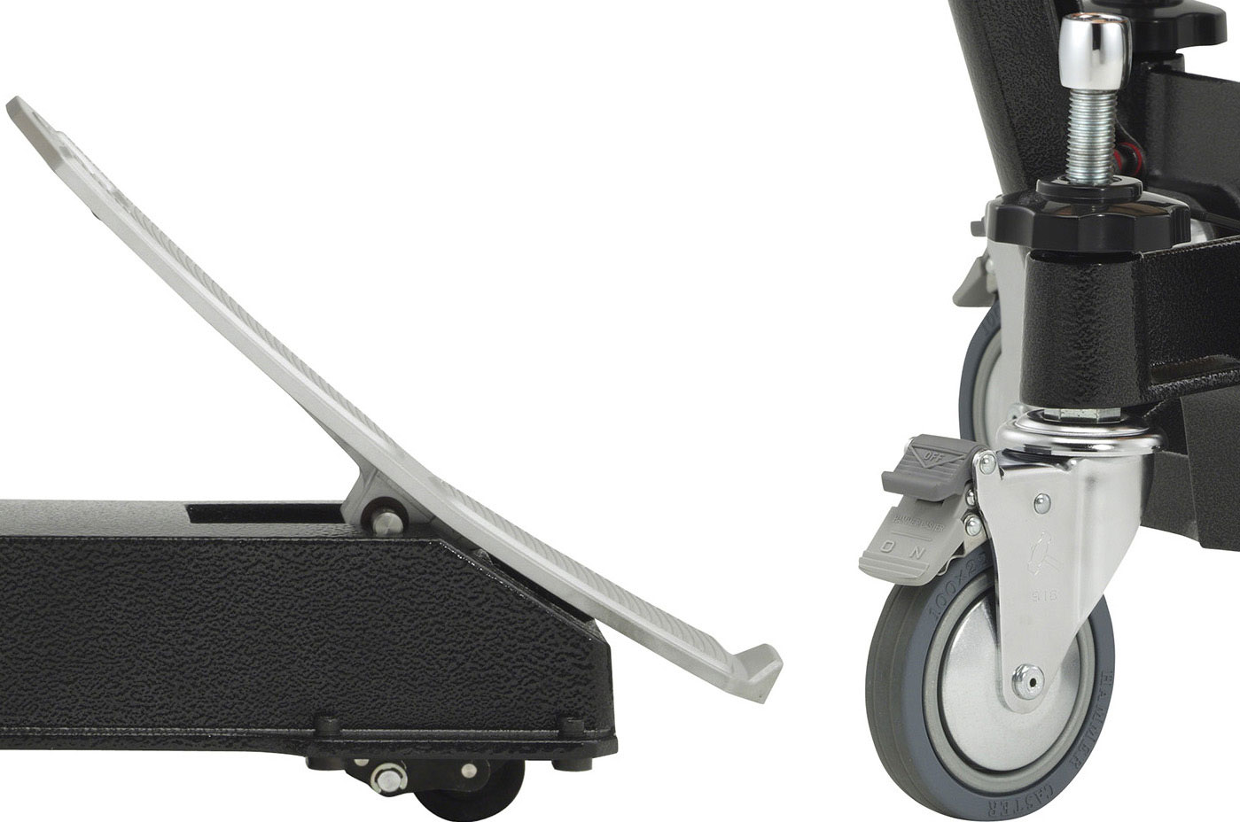 The main casters include a one-touch lock mechanism that contributes to fast, sure setup. In addition to the main caster lock mechanism an auxiliary brake has been added to the pedal caster. The player can engage the auxiliary brake to securely lock the caster and prevent movement of the instrument.