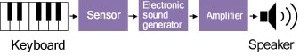 In contrast, the digital piano has no strings. Each key is a switch to produce a specific sound, so to speak. An electronic tone generator produces the sounds, which are amplified using a speaker.