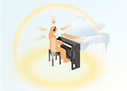 Když si nasadíte sluchátka, tak díky funkci Stereophonic Optimizer si můžete užít prostorový zvuk, který uslyšíte, pokud si sednete za akustický klavír. Díky funkci Stereophonic Optimizer se zdá, že zvuky vzorkované z akustických pian* vycházejí přímo z těla nástroje. Toto poskytuje pohodlný přirozený požitek ze hry, který odstraňuje nevýhody hraní s nasazenými sluchátky.