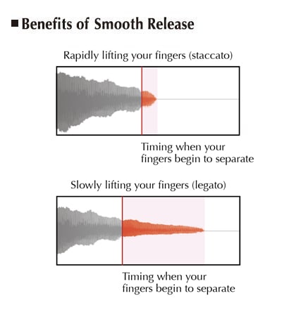 Díky technologii Yamaha Smooth Release nabízí Clavinova řízný tón, který můžete slyšet při hře staccato, stejně jako přeznívající tón při pomalém uvolňování kláves. To umožňuje jemné odstupňování odezvy na úhoz klavíristy.