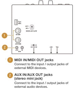 - AUX and MIDI terminals allow the sound to be output to a variety of external devices (e.g. stereo components, IC recorders, speakers with built-in amplifiers, stereo systems).