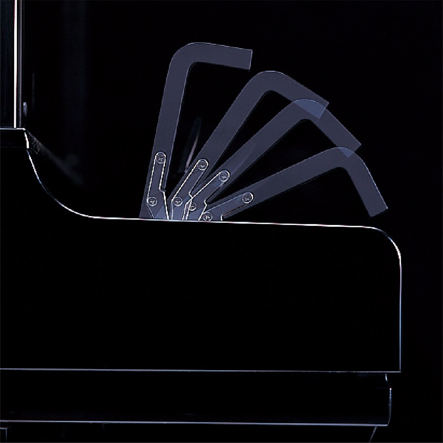 For added convenience and protection, these models feature a soft-close mechanism that slowly closes the fallboard. In addition, the gently curved design of the side arm was realized by arranging rotating metal fittings in the back of the keyboard lid. The polished ebony finish of the YUS1 and YUS3, as well as the artificial leather bed on the shelf of the music rest which prevents music sheets from slipping, give a sense of serene quality to the overall appearance. These pianos also provide a standard safety lock to protect your treasured instrument.