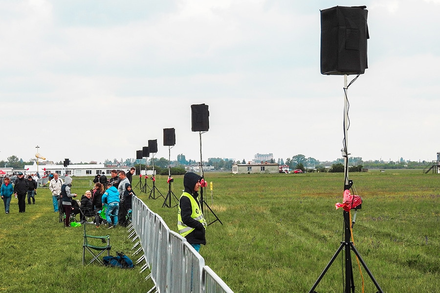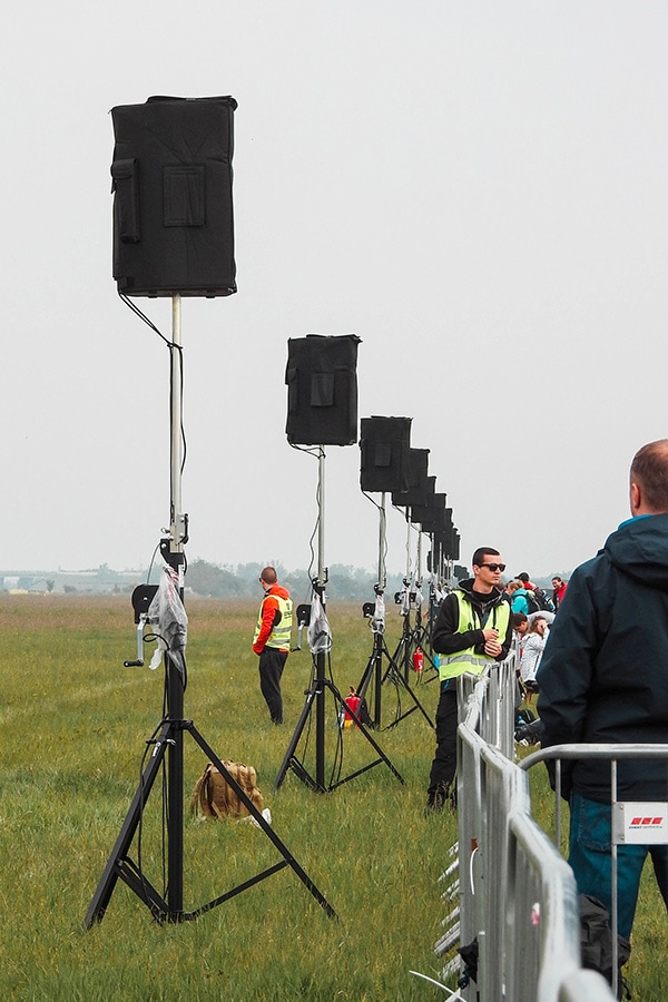 „Museli jsme vzít v úvahu, že v hlavní oblasti může být až 100.000 diváků a všichni musí slyšet a rozumnět oznámením, i když bude zrovna prolétávat letoun a i za špatného počasí, jako je silný vítr a déšť. Reproduktory bylo možné rozmístit pouze podél hranice divácké zóny.“