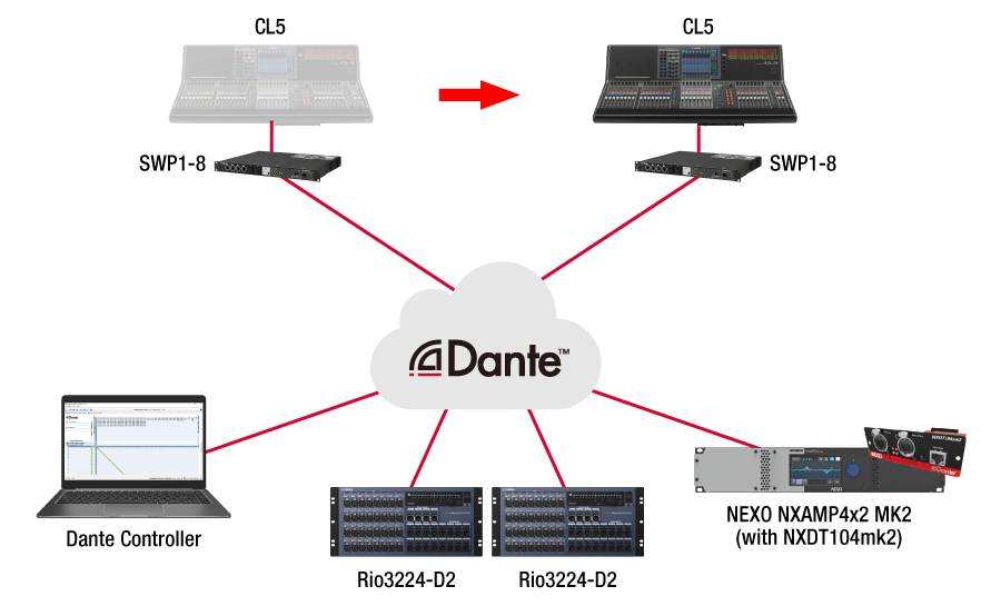 Pokud je hlavní (master) zařízení odpojeno z Dante sítě, tak další zařízení automaticky převezme master ovládáníbez přerušení audia nebo ztráty synchronizace.