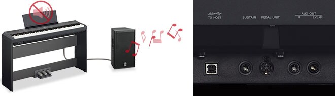 The P-115 comes with AUX-OUT terminals that allow audio to be output to an external speaker for powerful performances during live events, parties, and other occasions, permitting the instrument to be used in a wide variety of situations.