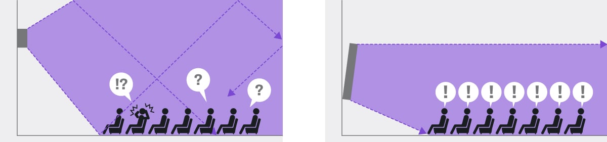 Vertically coupled line array speakers easily provide full, uniform coverage in a sloping lecture hall where a single speaker would not be sufficient.